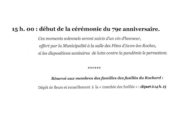 La cérémonie du 79e anniversaire du sacrifice des résistants fusillés au camp du Ruchard les 17 mai et 27 octobre 1942, et des fusillés d’Indre-et-Loire qui se déroula le samedi 2 octobre, a été une fois de plus célébrée sous la pluie.